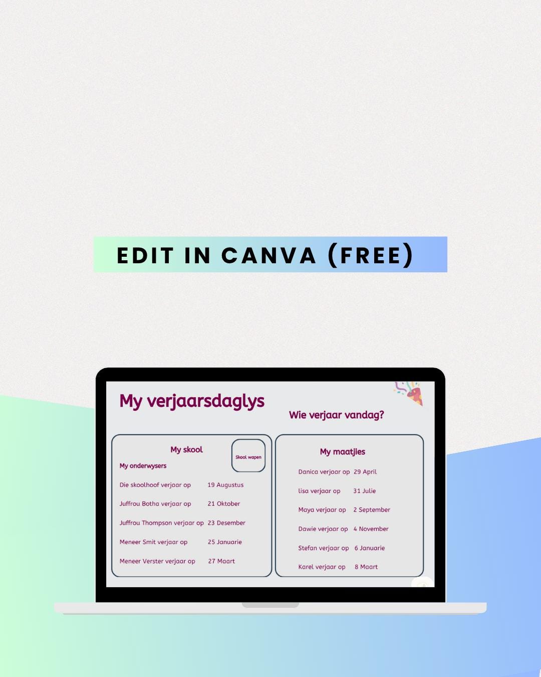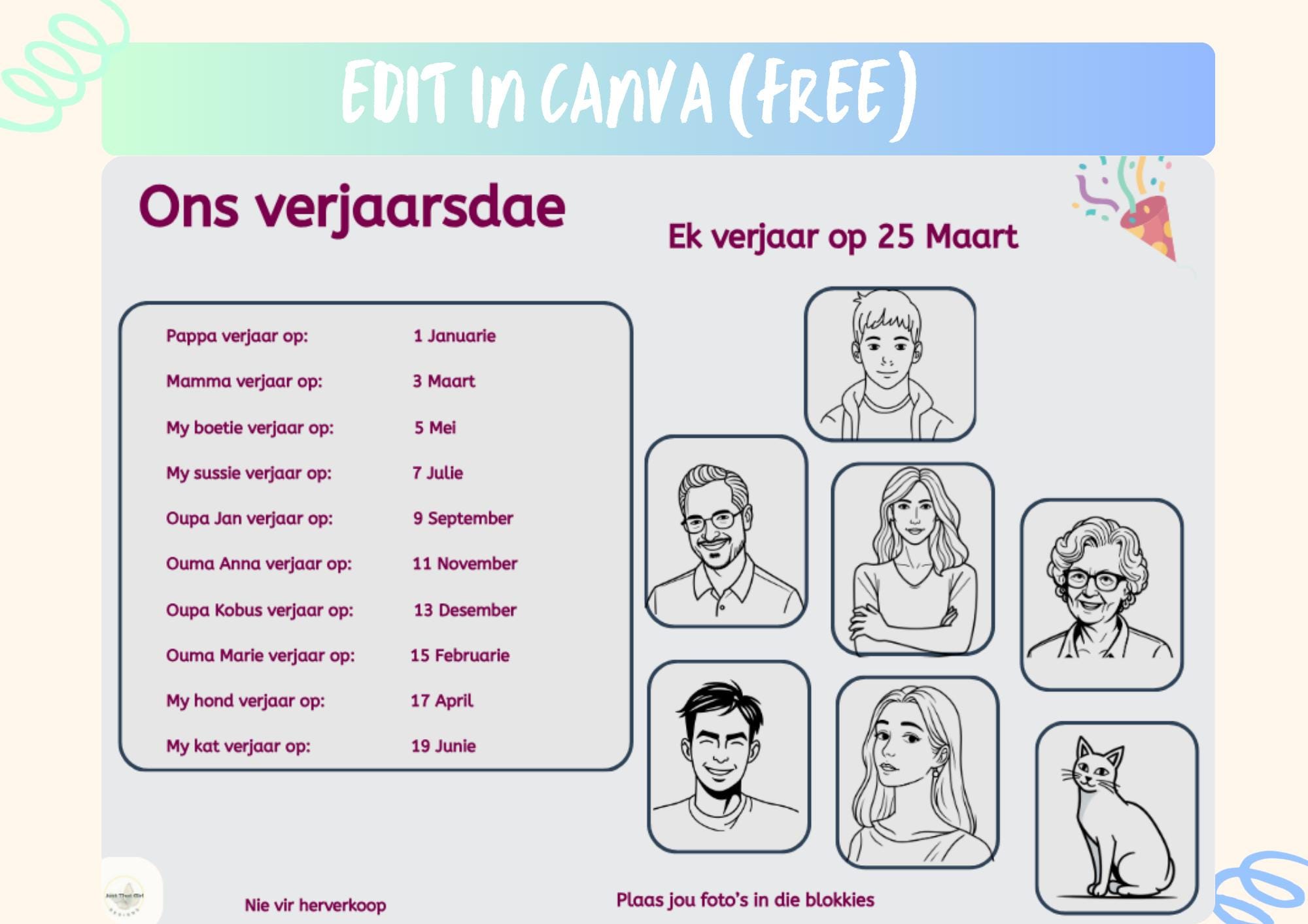 Die digitale kinder verjaarsdag kalender maak dit maklik om verjaarsdae te onthou. Reeds gestel op A4 Landscape vir uitdruk, is dit ideaal vir 'n kinderkamer. Lamineer of stoor op rekenaar vir vinnige veranderinge. Voeg fotos in en maak mooi, gepas vir jou. Verander gratis met Canva.