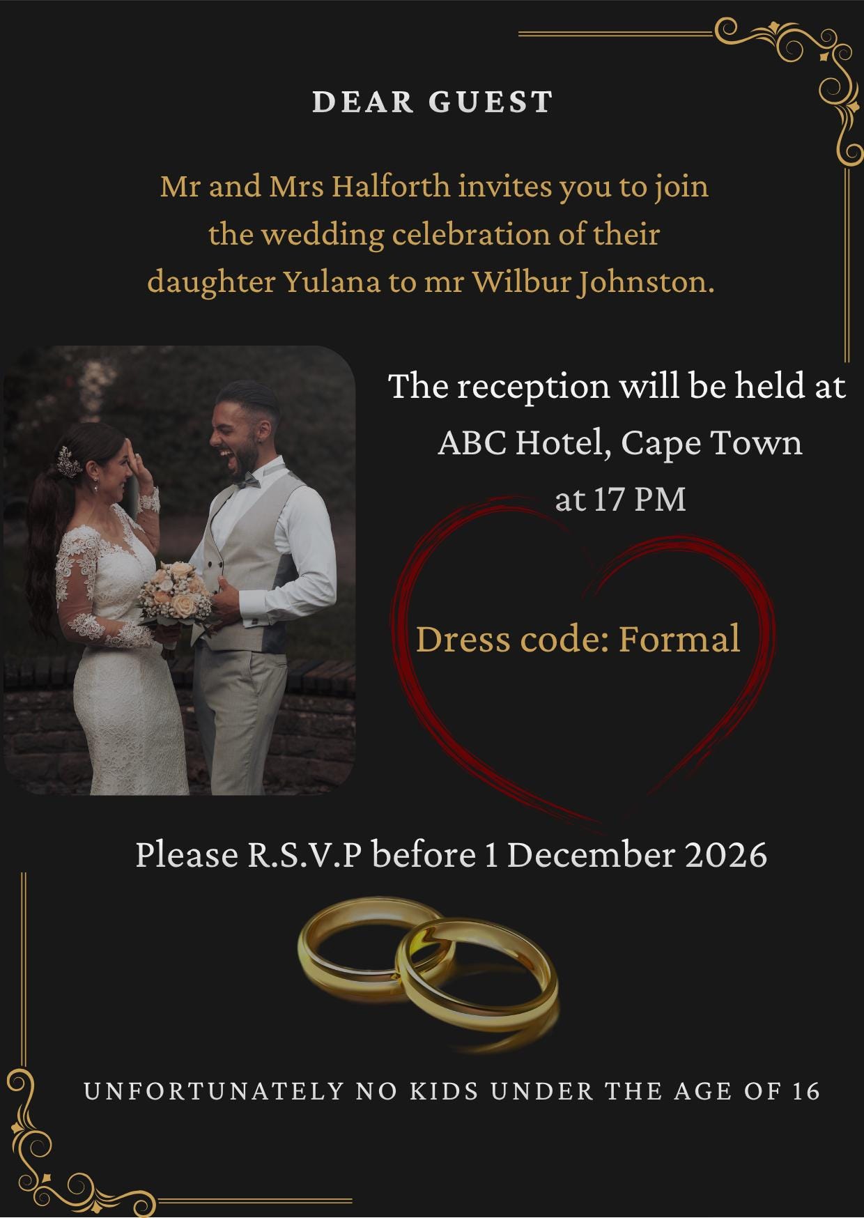 The wedding invitation digital card makes it easy to share amongst friends and family. No more worrying about posting invitations, not knowing if it will arrive. Edit in Canva free and send via your socials.